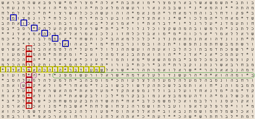 Code by Fab You do not know Legend : Main term at a skip of 5307 : «You do not know. Light/lightning (reversed) » ...The day ...The hour (thin purple circles) Hear you the word of the Lord; Thus saith the Lord ! (yellow squares) In that day there shall be a great earthquake in the land of Israel, they shall shake at my presence... (green shape) Matthew 24:3 And as He was sitting on the Mount of Olives, the disciples came to Him privately, saying, "Tell us, when will this be, and what will be the sign of your coming, and of the consummation of the age?" 4 And Yeshua answered and said to them, "See to it that no one misleads you. 5 "For many will come in My name, saying, `I am the anointed one,΄ and mislead many. 6 "And you will be hearing of wars and rumors of wars; see that you are not troubled, it is necessary for these things to occur, but the end is not yet. 7 "For nation will rise against nation, and kingdom against kingdom, and in various places there will be famines and earthquakes. 8 "But all these things are the beginning of birth pains. 9 "Then they will deliver you to tribulation, and will kill you, and you will be hated by all nations because of My name. 10 "And at that time many will be offended and will deliver up one another and hate one another. 11 "And many false prophets will arise, and will mislead many. 12 "And because lawlessness is multiplied, most people's love will grow cold. 13 "But the one who endures to the end, he shall be saved. 14 "And this good news of the Kingdom shall be proclaimed in the whole world for a testimony to all the nations, and then the end shall come. 15 "Therefore when you see the ABOMINATION OF DESOLATION which was spoken of through Dani'el the prophet, standing in the Holy Place -- let the reader understand -- 16 "then let those who are in Yehudah escape to the mountains; 17 "let him who is on the housetop not go down to take things that are in his house; 18 "and let him who is in the field not turn back to get his garment. 19 "But woe to those who are with child and to those who nurse in those days! 20 "But pray that your flight may not be in the winter, neither on a Shabbat; "for then there will be great tribulation, such as has not occurred since the beginning of the world until now, nor ever shall be. 22 "And unless those days had been shortened, no flesh would have been saved; but for the sake of the elect those days shall be shortened. 23 "Then if anyone says to you, `Behold, here is the Messiah,΄ or, `There He is,΄ do not believe. 24 "For false messiahs and false prophets will arise and will show great signs and wonders, so as to mislead, if possible, even the elect. 25 "Behold, I have told you beforehand. 26 "If therefore they say to you, `Behold, He is in the wilderness,΄ do not go forth, or, `Behold, He is in the inner chambers,΄ do not believe it. 27 "For just as the lightning comes from the east, and flashes even to the west, so shall the coming of the Son of Man be. 28 "Wherever the corpse is, there the vultures will gather together. 29 "But immediately after the tribulation of those days THE SUN WILL BE DARKENED, AND THE MOON WILL NOT GIVE ITS LIGHT, AND THE STARS WILL FALL FROM THE SKY, and the powers of the heavens will be shaken, 30 "and then the sign of the Son of Man will appear in the heavens, and then all the tribes of the Earth will mourn, and they will see the Son of Man coming on the clouds of the sky with power and great glory. 31 "And He will send forth His angels with a great trumpet, and they will gather together His elect from the four winds, from one extreme of the heavens to the other extreme. 32 "Now learn the parable from the fig tree: when its branch has become tender and puts forth its leaves, you know that summer is near; 33 "even so, you, when you see all these things, recognize that He is near, at the doors. 34 "Truly I say to you, this race will not pass away until all these things occur. 35 "Heaven and Earth will pass away, but My words will not pass away. 36 "But of that day and hour, no one knows, not even the angels of Heaven, nor the Son, but the Father only. 37 "For the coming of the Son of Man will be just like the days of Noach. 38 "For just as in those days which were before the flood, they were eating and drinking, marrying and giving in marriage, until the day that Noach entered the ark, 39 "and they did not understand until the flood came and took them all away by violence; so shall the coming of the Son of Man be. 40 "Then there shall be two men in the field; one will be taken alongside, and one will be left alone. 41 "Two women will be grinding at the mill, one will be taken alongside, and one will be left alone. 42 "Therefore keep watch, for you do not know which day your Lord is coming. 43 "But know this, that if the housemaster had known in what watch of the night the thief was coming, he would have been on the watch and would not have allowed his house to have been broken into. 44 "Therefore you also must be ready; for the Son of Man is coming at an hour when you do not think He will. 45 "Who then is the faithful and sensible slave whom his lord put in charge of his household to give them their nourishment at the proper time? 46 "Blessed is the slave whom his lord finds so doing when he comes. 47 "Truly I say to you, that he will put him in charge of all of his possessions. 48 "But if the evil slave says in his heart, `My lord is not coming for a long time,΄ 49 "and shall begin to beat his fellow slaves, and eat and drink with drunkards, 50 "the lord of that slave will come on a day when he does not expect, and at an hour which he does not know, 51 "and shall cut him in pieces, and assign him a portion with the hypocrites; there shall be weeping and the gnashing of teeth. Matthieu 25:1 "Then the Kingdom of Heaven will be comparable to ten virgins, who took their lamps, and went out to meet the bridegroom. 2 "And five of them were foolish, and five of them were prudent. 3 "For 