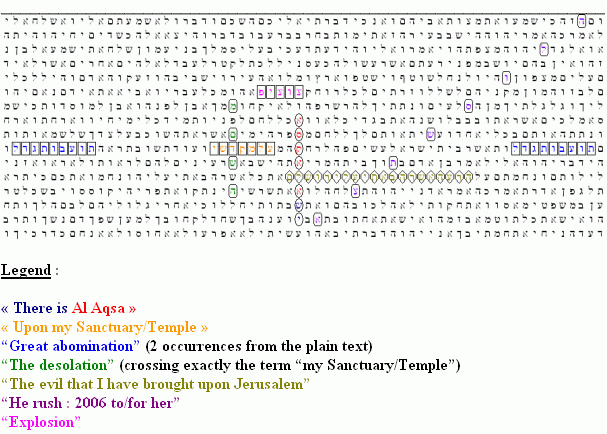 Code by Fab The Abomination that causes Desolation Daniel 9:27, 11:31, 12:11 also Matthew 24:15 and Mark 13:14 The expression "great abomination" appears 2 times in the plain text and in the same verse where is found "upon my sanctuary/Temple" (Ezekiel 8:6), but they are farther from the main term. "The desolation", as it is spelled in Daniel (in Aramean), is found only once exactly crossing the expression "upon my Temple" !!! |